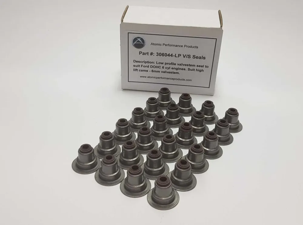 Atomic Performance Products low profile 6mm valve stem seal set x24 to suit Ford Barra DOHC BA-FGX series engines. These are a must have for high lift aftermarket camshafts, as other brands can interfere with the stem seal.