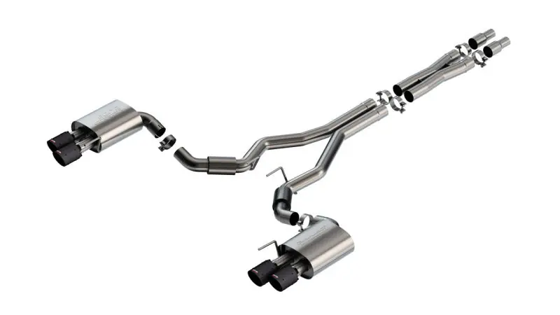 This 3″ diameter True Dual Quad tip Borla(r) Cat-Back(tm) system features a merge X-Pipe for increased performance and improved sound. This system features the classic S-Type sound with no drone inside the vehicle and 4″ carbon fiber tips, and is for vehicles WITHOUT the Active Exhaust feature. Systems with bright chro