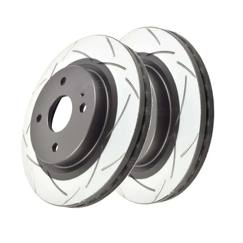 DBA’s Street Series rotors can be further enhanced with optional slots known as T2 – 32 CNC machined bi-directional curved slots. Machined slots in the friction surface allow a channel for braking by-products – brake dust and gasses from the incredible heat – to escape. This has a multitude of benefits, from reducing pad contamination, controlling heat build-up, and brake pad knock back. These combine to enhance braking performance and increase service life of the pads and rotors. Compared to more common straight slots, the unique curved slot design reduces the noise associated with ‘racing’ brakes, and minimises any detriment to pad surface condition.