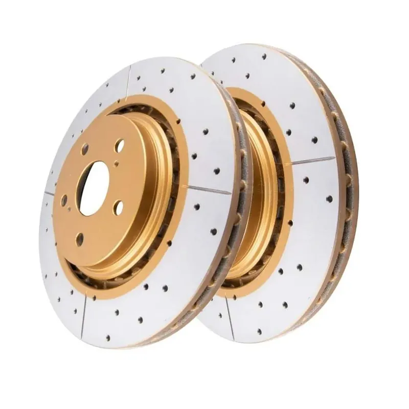 DBA rotors can be improved with the X-Gold design, a unique non-directional cross-drilled pattern that increases passive cooling, allows for gas-escape whilst maintaining excellent rigidity. The performance realised is similar to the T2 slotted range, however the aesthetics are further enhanced with all of the non-friction surfaces being coated in a unique gold paint.