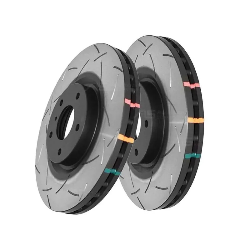 DBA’s 4000 Series and 5000 Series rotors can be further enhanced with optional slots known as T3 – 48 CNC machined tri-directional curved slots. Machined slots in the friction surface allow a channel for braking by-products – brake dust and gasses from the incredible heat – to escape. This has a multitude of benefits, from reducing pad contamination, controlling heat build-up, and brake pad knock back. These combine to enhance braking performance and increase service life of the pads and rotors. Compared to more common straight slots, the unique curved slot design reduces the noise associated with ‘racing’ brakes, and minimises any detriment to pad surface condition.
