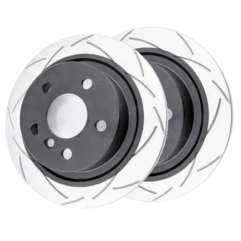 DBA’s Street Series rotors can be further enhanced with optional slots known as T2 – 32 CNC machined bi-directional curved slots. Machined slots in the friction surface allow a channel for braking by-products – brake dust and gasses from the incredible heat – to escape. This has a multitude of benefits, from reducing pad contamination, controlling heat build-up, and brake pad knock back. These combine to enhance braking performance and increase service life of the pads and rotors. Compared to more common straight slots, the unique curved slot design reduces the noise associated with ‘racing’ brakes, and minimises any detriment to pad surface condition.