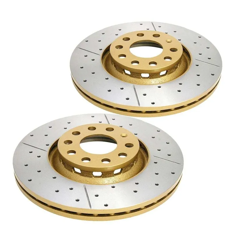 DBA rotors can be improved with the X-Gold design, a unique non-directional cross-drilled pattern that increases passive cooling, allows for gas-escape whilst maintaining excellent rigidity. The performance realised is similar to the T2 slotted range, however the aesthetics are further enhanced with all of the non-friction surfaces being coated in a unique gold paint.