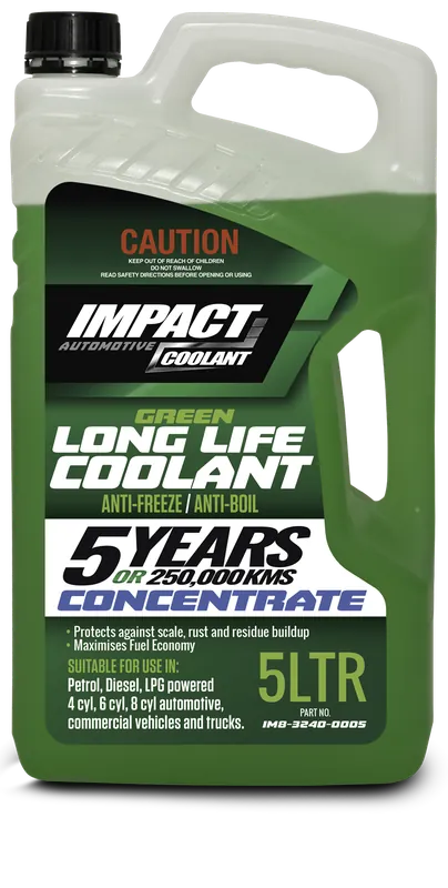 Impact Automotive Green Long Life Coolant is a unique blend of organic long life corrosion inhibitors and ethylene glycol designed to provide superior corrosion protectant and anti-freeze/anti-boil protection for many types of petrol, diesel and gas engines in light commercial and passenger vehicles, heavy duty commercial, industrial, on highway, marine, mining and stationary applications.